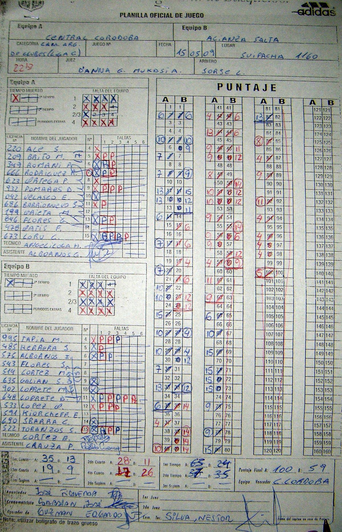 – CENTRAL CORDOBA: Facundo Romani 10,Raúl Rodriguez 12,Esteban Velasco 18, Gonzalo Flores 9 y César Lorú 10 (FI); Sergio Ale 16, Miguel Brito 2, Pablo Ortega 3, Daniel Pomares 15 y Julio Barrionuevo 5. DT: Hugo Angelicola