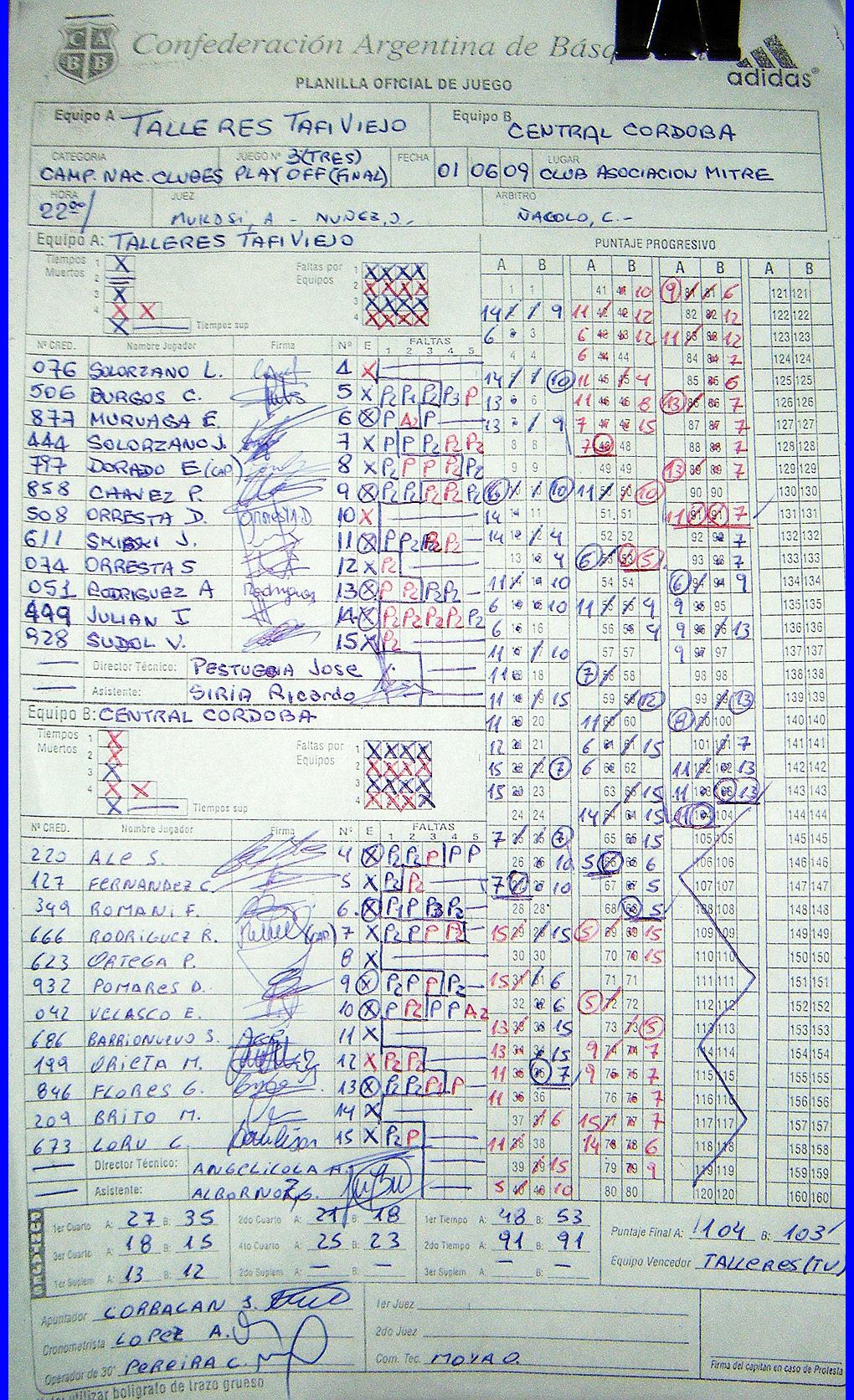 El partido estaba para cualquiera de los dos equipos, aparece Gonzalo Flores y convierte 7 puntos seguidos, parecía que ganaba «CC», pero en una jugada muy poco habitual convierte Dorado desde los 6,25 para darle vida nuevamente a Talleres, que con dos tiros libres de Skibsky lleva a su equipo a los 104 puntos, ya es para el recuerdo el tiro libre errado que hubiese alargado el partido.