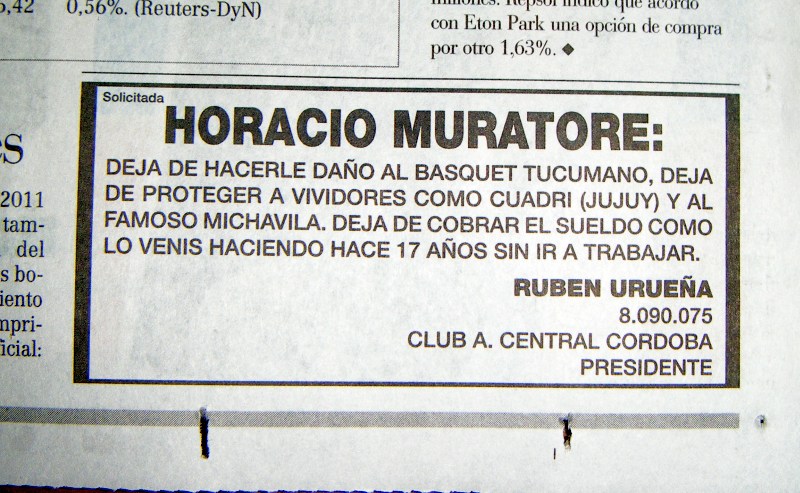 El presidente de Central Córdoba de Tucumán –Rubén Urueña– publicó hoy en el diario local LA GACETA (el de mayor tirada de nuestra provincia) una solicitada para el past-president de la CABB y vicepresidente de FIBA: HORACIO MURATORE.