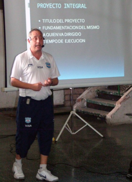 Ayer, durante el desarrollo de la primera Clínica ENEBA en el «Dionisio Muruaga», volvió a exhibir su capacidad didáctica cuando desarrolló los módulos cuatro y cinco, el primero referido a planificación general, anual por equipo, por períodos y plan diario de entrenamiento y el segundo, una intensa práctica con la Preselección argentina U19.